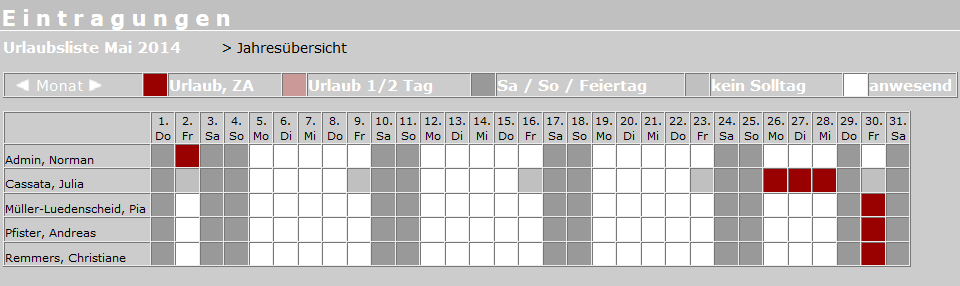 Aus den Eingaben der Zeiterfassung und den Soll-Arbeitszeiten wird eine stets aktuelle grafische Anwesenheits- bzw. Urlaubsübersicht erstellt.